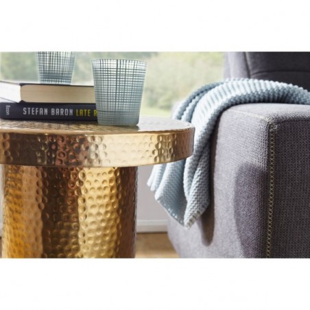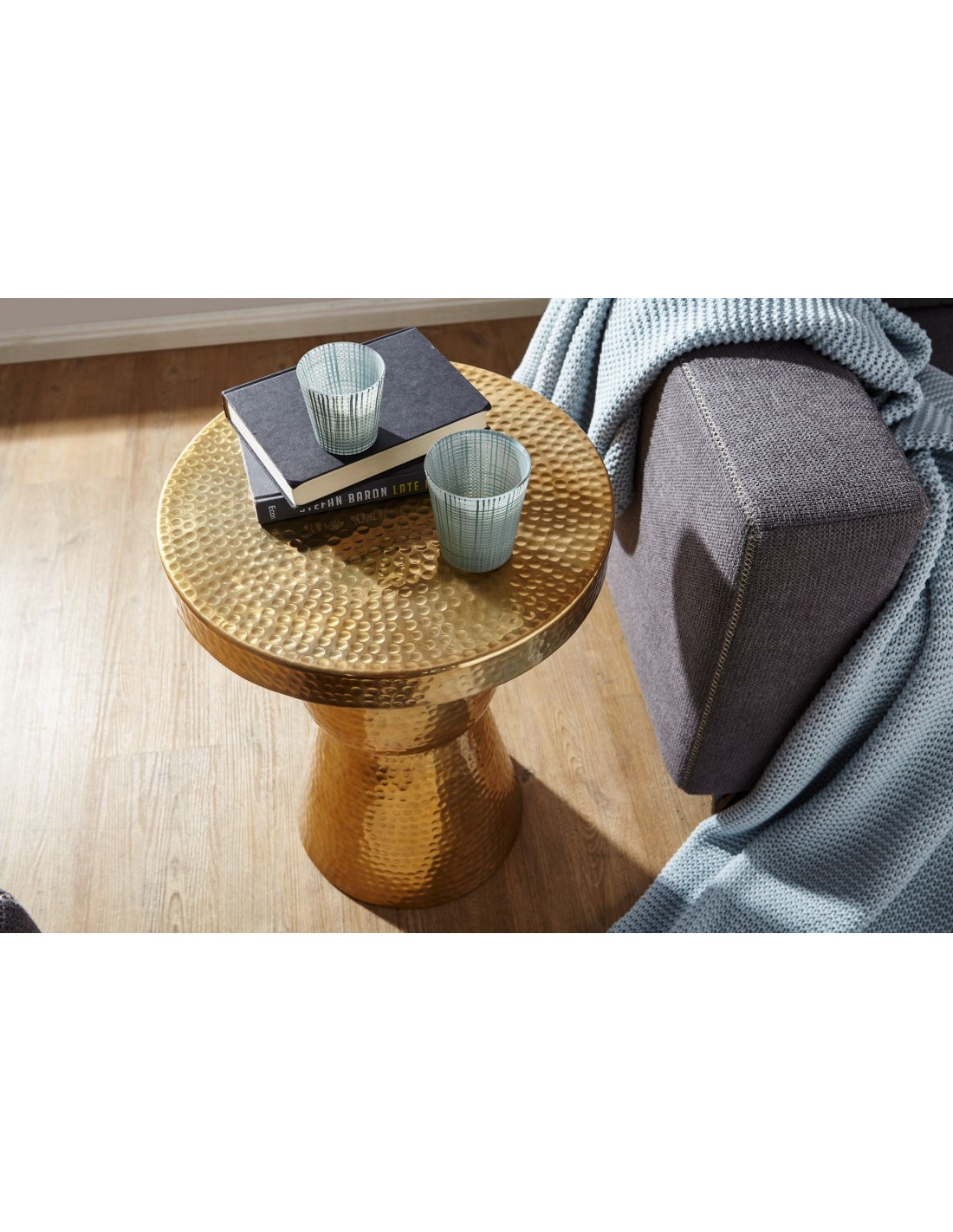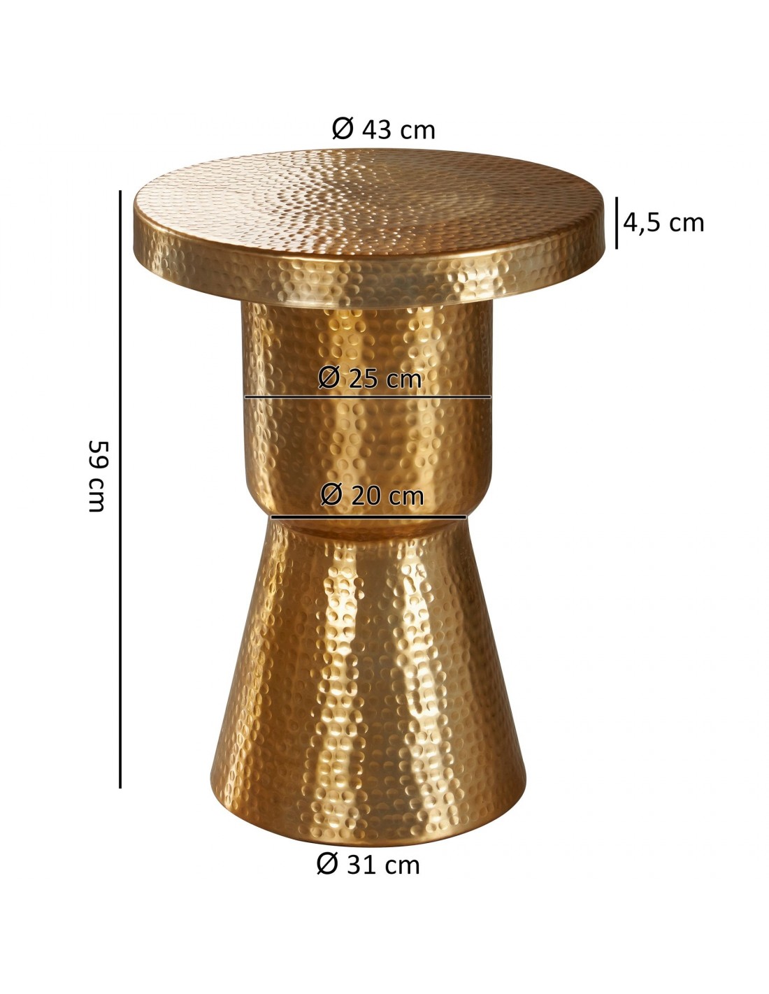 Design Extravaganter Dekotisch im orientalischen Design mit aussergewöhnlicher Form Ablagefläche bietet Platz für z. B. Dekoration, Blumen & Co. Wunderschöne Hammerschlag-Strukturen machen den Tisch zu einem absoluten Highlight Abmessungen Breite: 43 cm Höhe: 59 cm Tiefe: 43 cm Durchmesser der Ablagefläche: 43 cm Durchmesser der Standfläche: 31 cm Farbe Kompletter Dekotisch: Golden Besonderheiten Empfohlene max. Belastbarkeit: 15 kg Durch liebevolle Handarbeit ist jeder Beistelltisch ein absolutes Unikat Da die Unterkante nach innen gefalzt ist, werden unschöne Kratzer im Boden vermieden Hohe Stabilität durch das hochwertig verarbeitete Aluminium und die runde Form Material Kompletter Anstelltisch: Aluminium Pflegehinweise Die Oberfläche mit einem lauwarm angefeuchteten Baumwolltuch reinigen. Bitte keine harten Bürsten oder Metallschwämme verwenden, da diese Kratzer im Metall verursachen. Keine Scheuermittel, scharfen Reinigungsmittel oder tropfnassen Tücher verwenden. Lieferumfang Ein Beistelltisch ohne Dekoration Montage Lieferzustand: Montiert und sicher verpackt