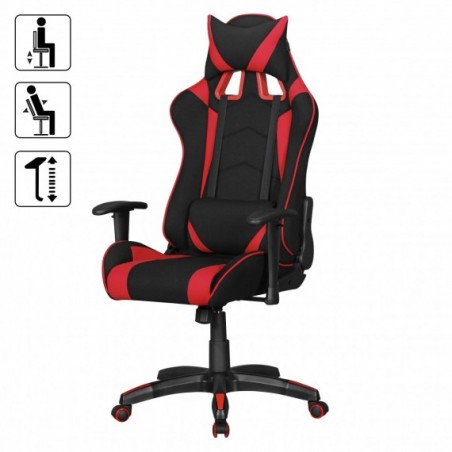 Design Moderner und bequemer Chefsessel im Racing Design Kissen, Rollen & Nylon-Fusskreuz mit passenden Farbelementen Erhöhte Seitenflanken an Sitzfläche & Rückenlehne Sitzfläche & Rückenlehne mit farblich passenden Abnähern Farbe Schwarz / Rot Besonderheiten Wippmechanik ist an einer Position feststellbar und individuell auf Ihr Körpergewicht einstellbar Lendenwirbelkissen ist entlang der Rückenlehne um 35 cm in der Höhe verstellbar Rückenlehnenneigung per Hebel in 12 Stufen bis zu 135° einstellbar - bei maximaler Einstellung: fast Liegeposition Beide Armlehnen (mit Soft-Pad-Polsterung) sind um 7 cm (7 Stufen) in der Höhe einstellbar Sitzhöhe ist stufenlos um 10 cm einstellbar - dadurch auf Ihre Körpergrösse anpassbar Hartbodenrollen inkl. (Ideal für Laminat, Parkett, Fliesen) Material Rückenlehne, Sitzfläche & Kissen: Stoff Armlehnen & Fusskreuz: Kunststoff Textilzusammensetzung Bezug Rückenlehne, Sitzfläche & Kissen: 100% Polyester Masse Gesamthöhe: 130 - 140 cm Sitzhöhe: 46 - 56 cm Armlehnenhöhe: 27 - 34 cm Höhe Rückenlehne: 84 cm Fusskreuz Ø: 70 cm - extra gross Gesamtbreite: 70 cm Gesamttiefe: 70 - 100 cm (je nach Einstellung) Sitz (BxT): 55 x 51 cm Lieferumfang 1 Gaming Chair (zerlegt) mit 2 Kissen Lieferung erfolgt ohne Dekoration Montage Leicht verständliche Aufbauanleitung